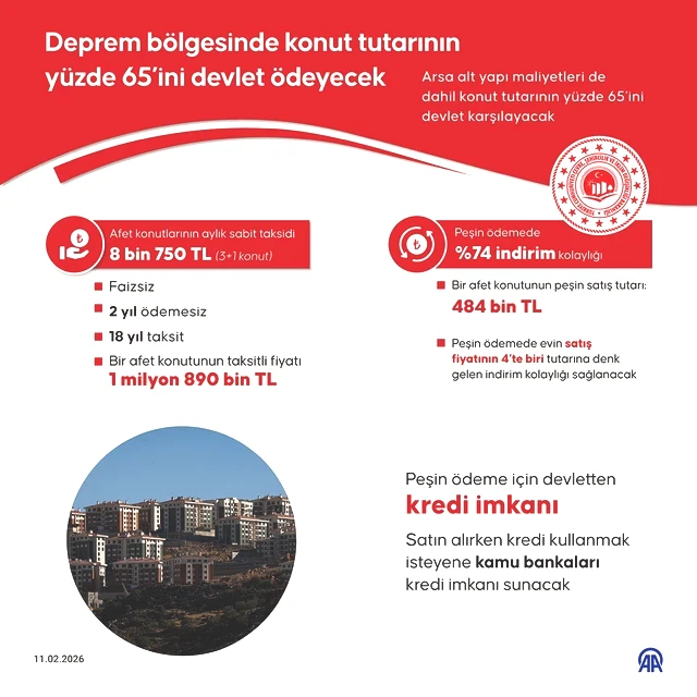 Öte yandan taksitle ev almak isteyen vatandaşlar, faiz ödemeden, iki yıl boyunca herhangi bir ödeme yapmadan ve 18 yıl boyunca sabit taksitlerle konut sahibi olabilecekler. Bu yöntemde, bir deprem konutunun toplam maliyeti 1 milyon 890 bin TL olarak belirlendi.
